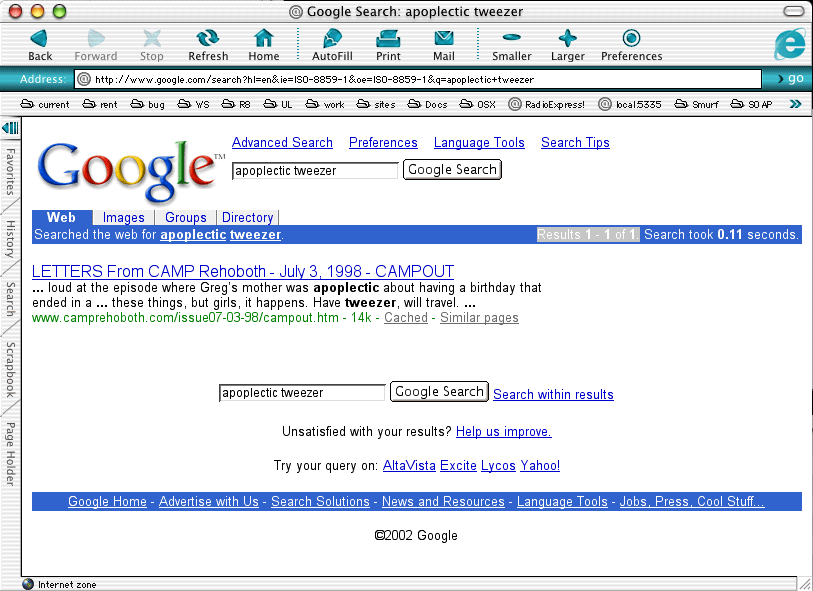 So I decided to do a quick experiment. How long would it take to really find one? I’d tried two or three searches for a minute or two each over the last couple of weeks, but didn’t find a true Googlewhack. Tonight I did:
